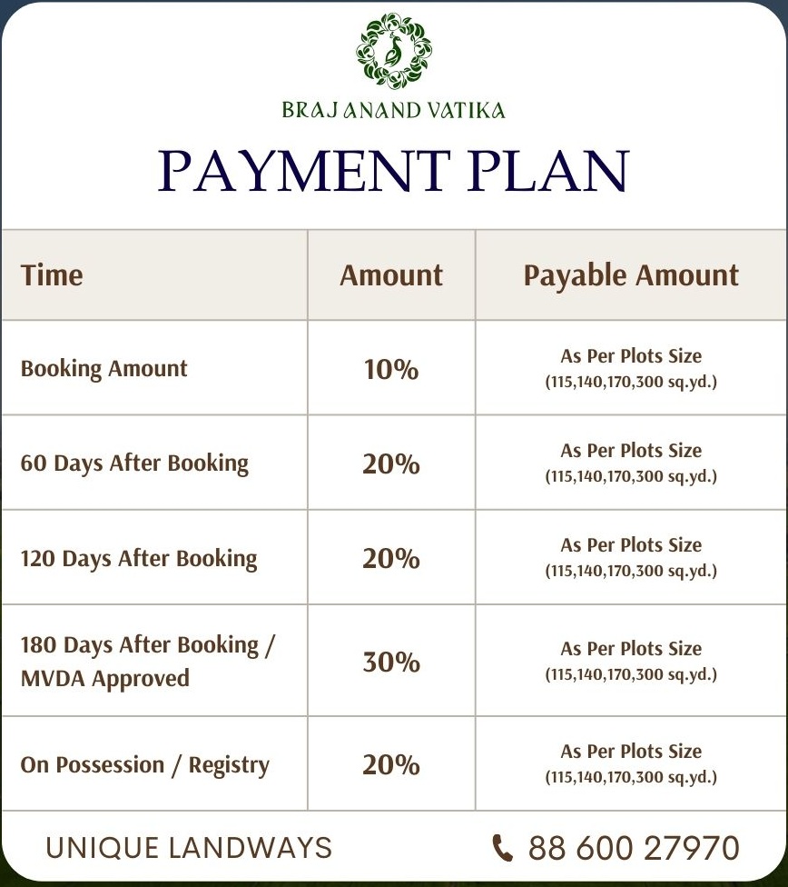 Whether you’re looking for a peaceful home, a spiritual escape, or a high-return investment, Braj Anand Vatika offers the perfect opportunity. Become a part of the divine journey of Vrindavan and secure your place in this holy land, where every sunrise brings blessings and every sunset brings peace The visuals of the creative showcase greenery, open space, and a peaceful environment. Our vision is exactly that—to offer a lifestyle that blends luxury with natural beauty. Wide roads, clean surroundings, lush greenery, and safe spaces make it ideal for families, senior citizens, and working professionals looking for a calm home environment.